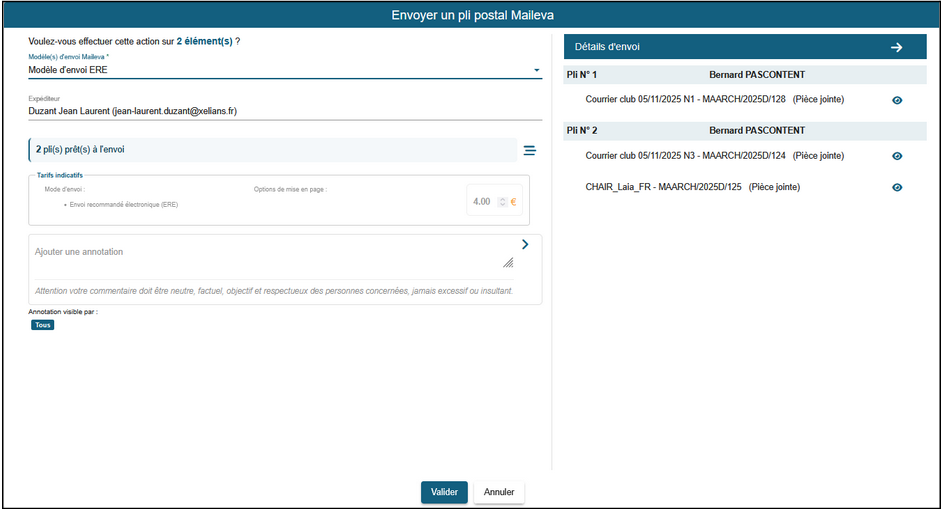 Dans la modale d’envoi vers Maileva, la partie droite présente la liste des plis par destinataire, chacun regroupant les documents associés. Cette fonctionnalité permet à l’utilisateur de contrôler visuellement les documents avant l’envoi vers Maileva, sans quitter la modale.