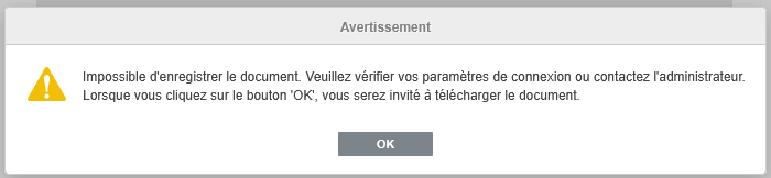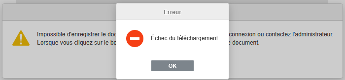 Le second est que lorsque je souhaite charger un modèle de document qui contient une pièce jointe, j’arrive à ouvrir le modèle mais pas la pièce jointe. Lorsque que j’essaye d’ouvrir la pièce jointe voici le message d’erreur (ce problème survient aussi si je souhaite éditer le modèle) :