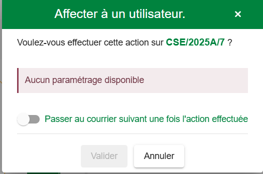 je voudrais que quelqu’un m’aide par rapport a mon problème : quand j’essaie d’affecter un courrier a un autre utilisateur j’ai une fenêtre qui s’affiche pour me dire " Aucun paramétrage disponible"; merci d’avance